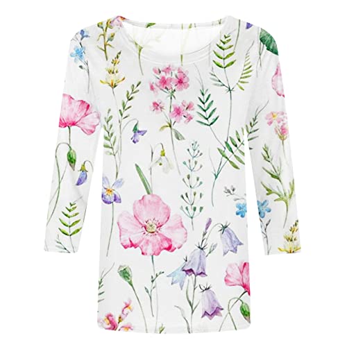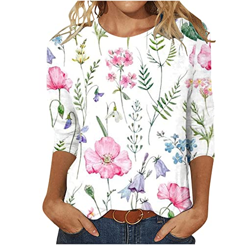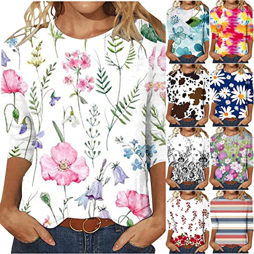 YRAETENM Womens Tops 3/4 Sleeve Summer Ethnic Floral Slim Cute Tops Crewneck Slim Fit Half Sleeve Tshirts Shirts Spring Blouse