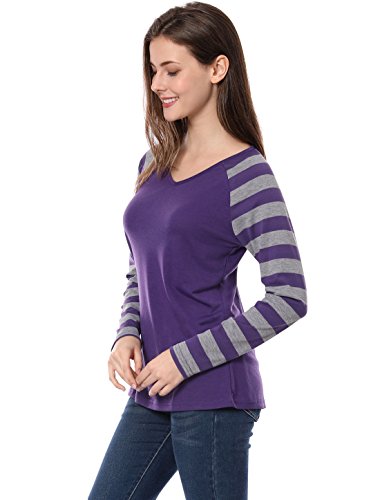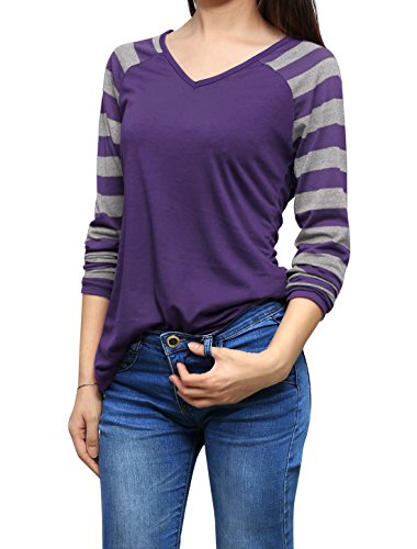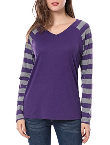 Allegra K Women’s Striped T-Shirt Color Block Long Raglan Sleeve V Neck Baseball Tee Shirt Top