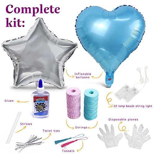[2PCS of All Accessories] – 3D Rope Arts and Crafts Set Includes Heart and Star Shape Balloons, Mixed Colors and Blue Rope, Glue, LED Lights (battery not included), Twisted Rope, Straws, Disposable Gloves, Tassels. Because of the complete tooling, you do not need to purchase tools to complete this manual.