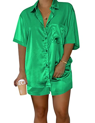 Material:Silk pajama set is made of Premium 95%Polyester+5%Spandex satin fabric.Ultra-soft and cozy satin Ekouaer sleepwear.Lounge sets for women with loose button down shirt and shorts set design,can be worn as pj set or alone.A must-have summer outfit sets in your wardrobe