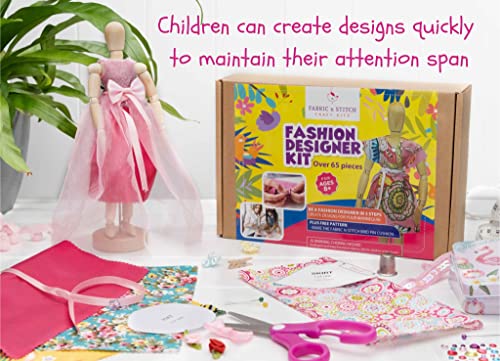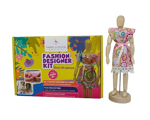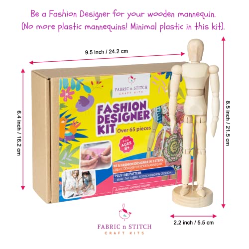 FABRIC n STITCH Fashion Designer Kits for Girls & Boys. Learn to Use Basic Patterns, Drape Fabrics, Sew, Re-Design & Draft A Pattern for The Small 8.5″ Wooden Mannequin. Sewing Kit for Kids