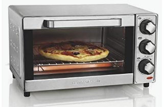 - SAVE TIME IN THE KITCHEN: The Hamilton Beach Toaster Oven conveniently toasts 4 slices of bread or a 9″ pizza, yet it doesn’t take up a too much space on the countertop.