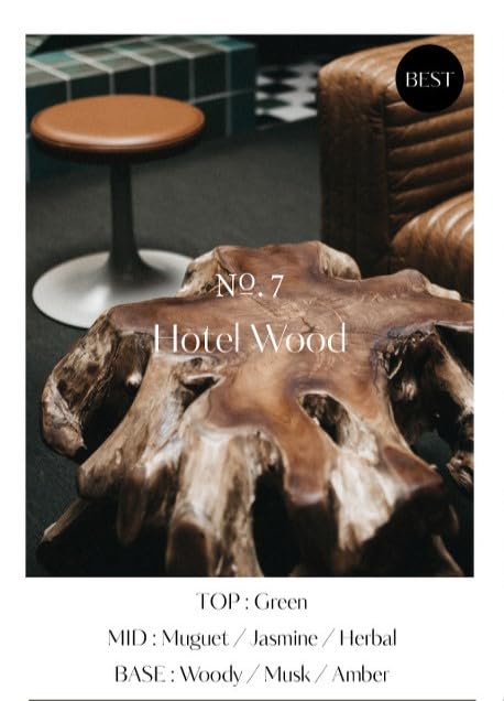 HOTEL WOOD SCENT: An aroma that is reminiscent of the lobby of a 5-star resort and awakens the forgotten relaxation. The deep smell of soil in a dense forest, the rough and heavy dark fragrance of large trees is conveyed in a neutral and elegant woody way.