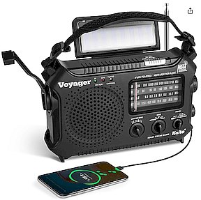 - 6-way powered portable emergency radio with hand crank generator, solar panel, compartment for 3 AA batteries (not included), 5V USB input, 5V AC/DC input with a wall power adapter (sold separately), built-in NiMH replaceable and rechargeable battery pack