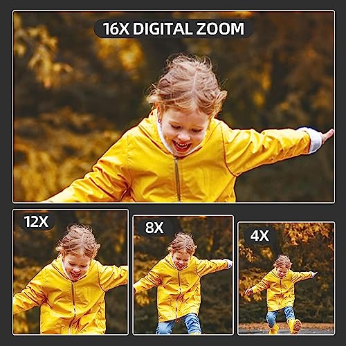 ă16X DIGITAL ZOOM MINI CAMERAăâ This digital camera supports 16X digital zoom when you taking video or photos. You can zoom in or zoom out according to your specific shooting scene. With super wide angle lens, you can get 45% more field of vision. With micro lens, you can capture all details of an object. Just take as many photos as you want because our digital camera with 32GB SD card is big enough to save all the details.