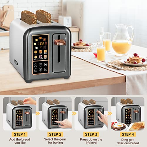 SEEDEEM Toaster 2 Slice, Stainless Steel Bread Toaster with LCD Display and Touch Buttons, 50% Faster Heating Speed, 6 Bread Selection, 7 Shade Settings, 1.5”Wide Slots Toaster with Cancel/Defrost/Reheat Functions, Removable Crumb Tray, 1350W, Dark Metallic