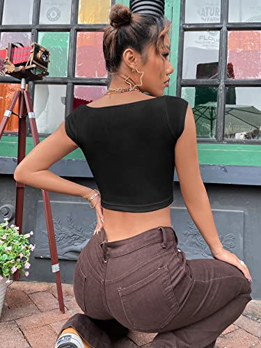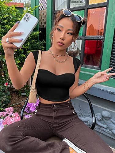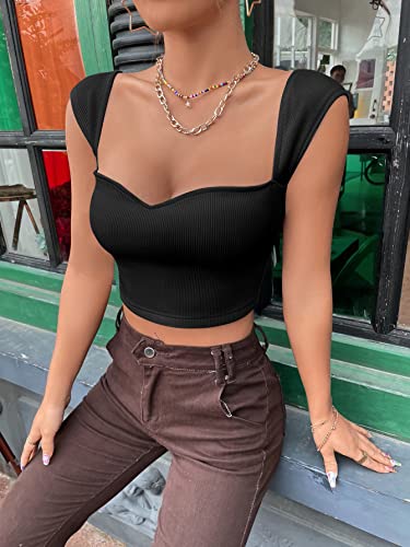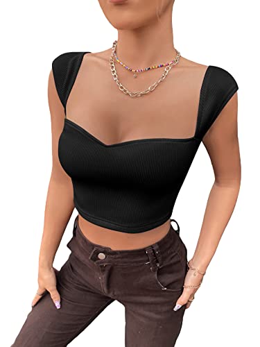 SheIn Women’s Sweetheart Neck Ribbed Knit Tee Top Cap Sleeve Slim Fit Crop T Shirt