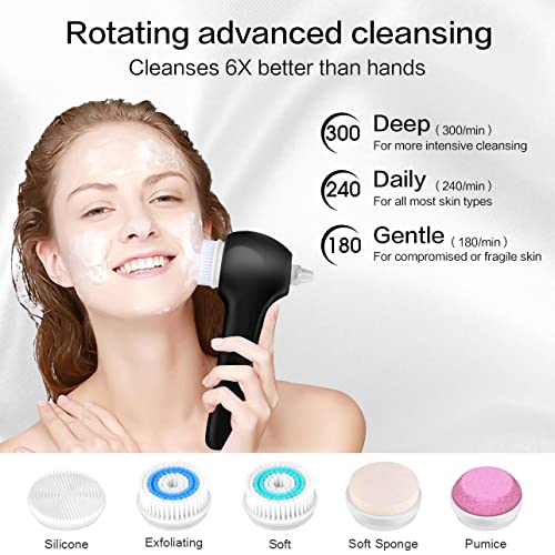 【360°ROTARY CLEANSING】Rotating brush with advanced technology,3 cleansing levels,5 brush heads,delivers superior cleansing on hard-to-remove makeup ,Gentle enough for daily use on even the most sensitive skin.Suitable for all types of skin.